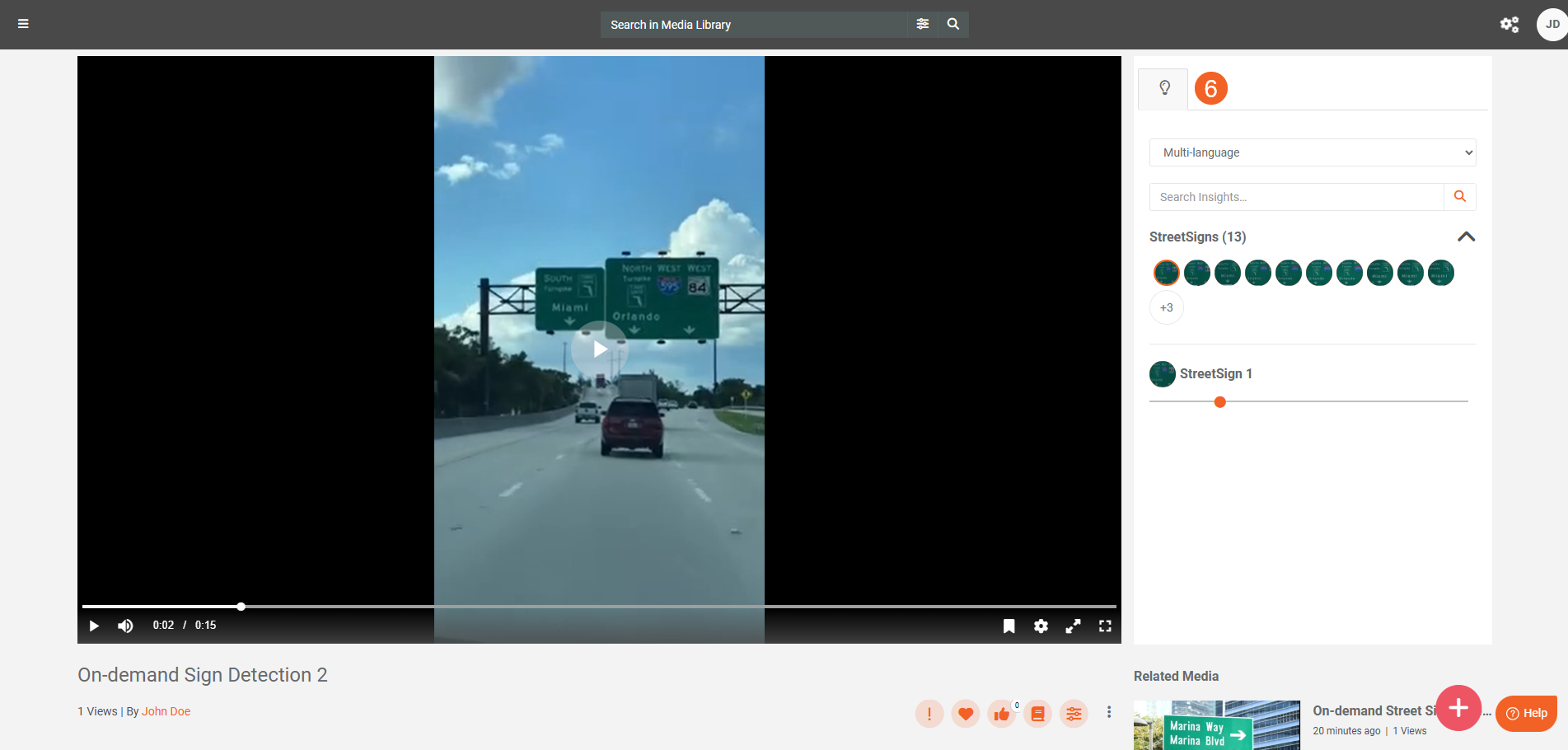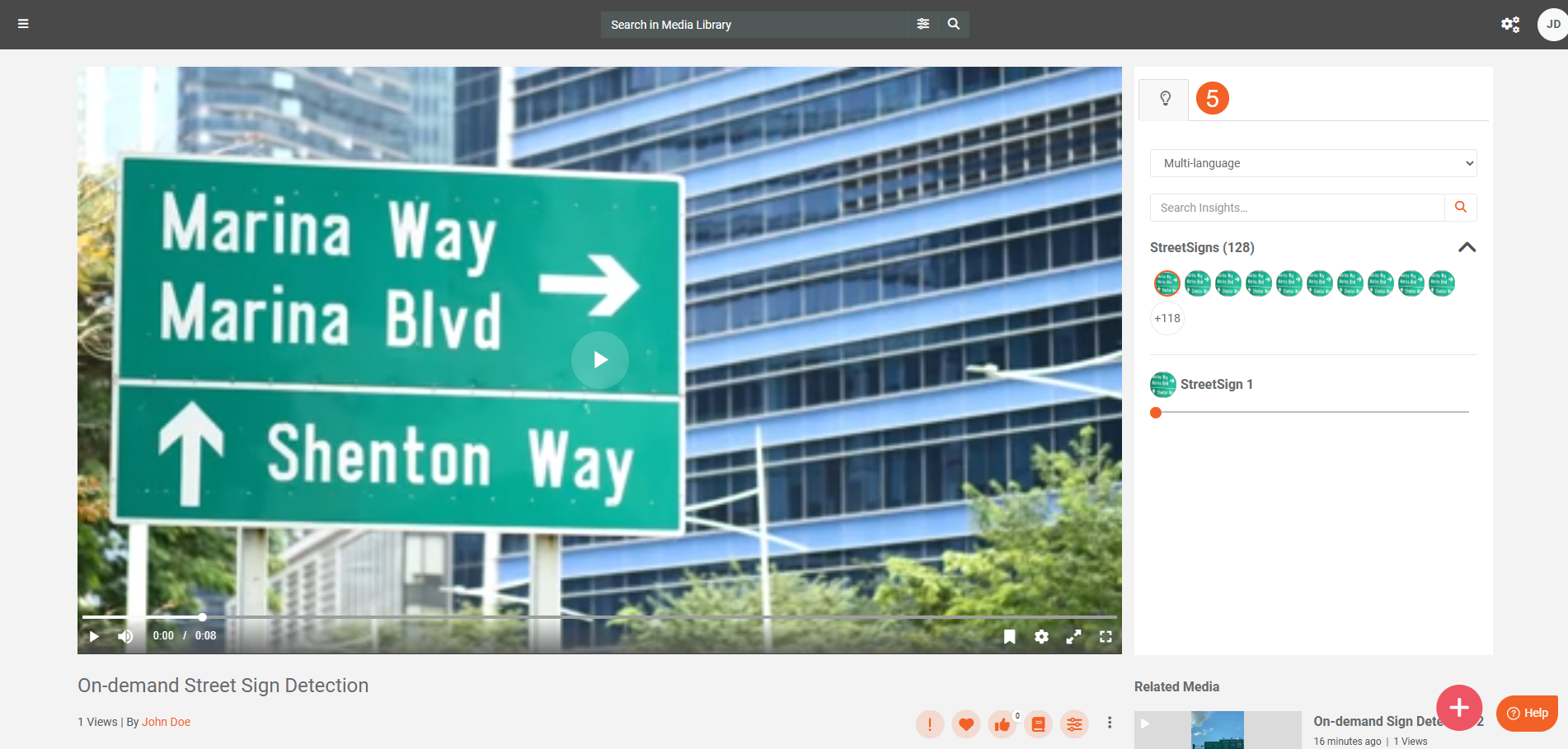 - When processing finishes, open your content to see the Street Sign detections in Insights.
